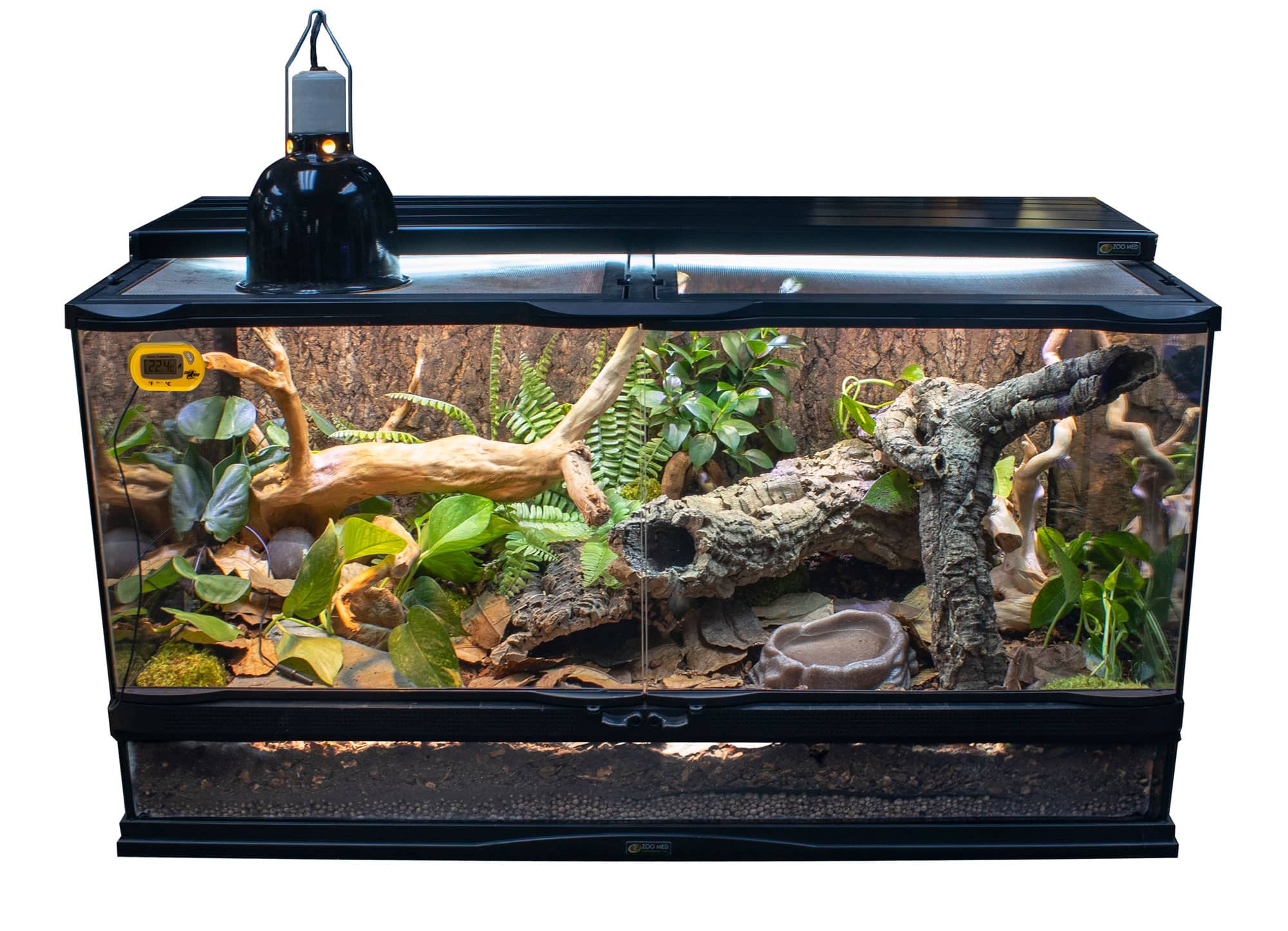 Branches, stones, half logs, and other décor items are used to create basking, climbing, perching, and hiding spaces for terrarium inhabitants.