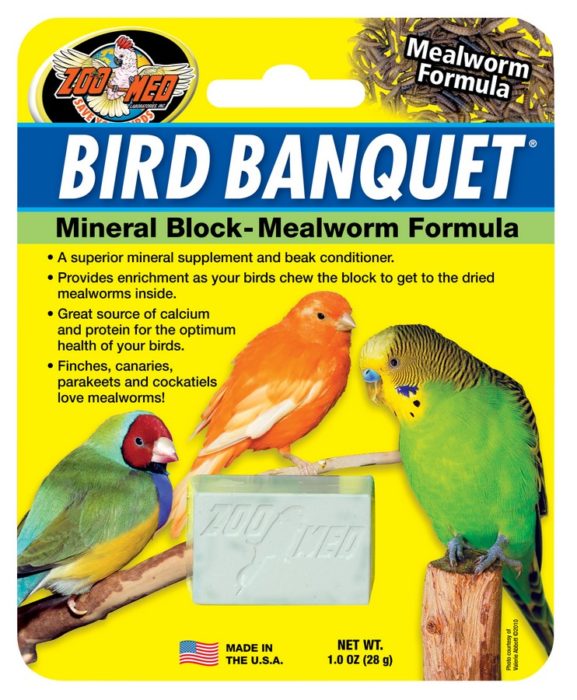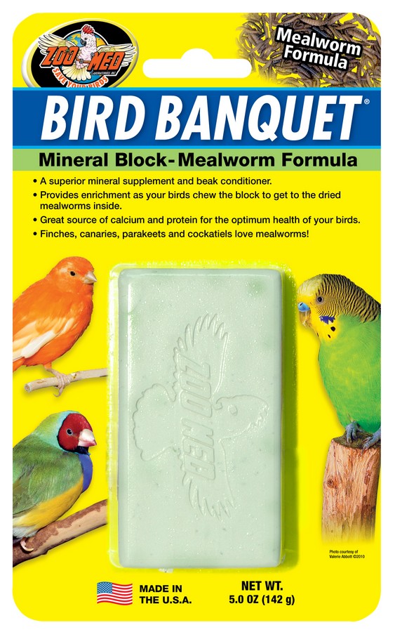 Zoo Med’s Mealworm Formula Bird Banquet® is a mineral supplement and beak conditioner that is a great source of calcium and protein, while providing enrichment for your feathered friend.