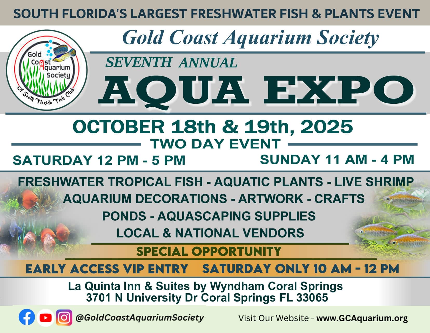 Aquatic expo hosted by the Golden Coast Aquarium Society in Coral Springs, FL. There will be lots of tropical fish, aquatic plants, shrimp, decorations, artwork, and more! Happening Saturday 12-5 and Sunday 11-4.