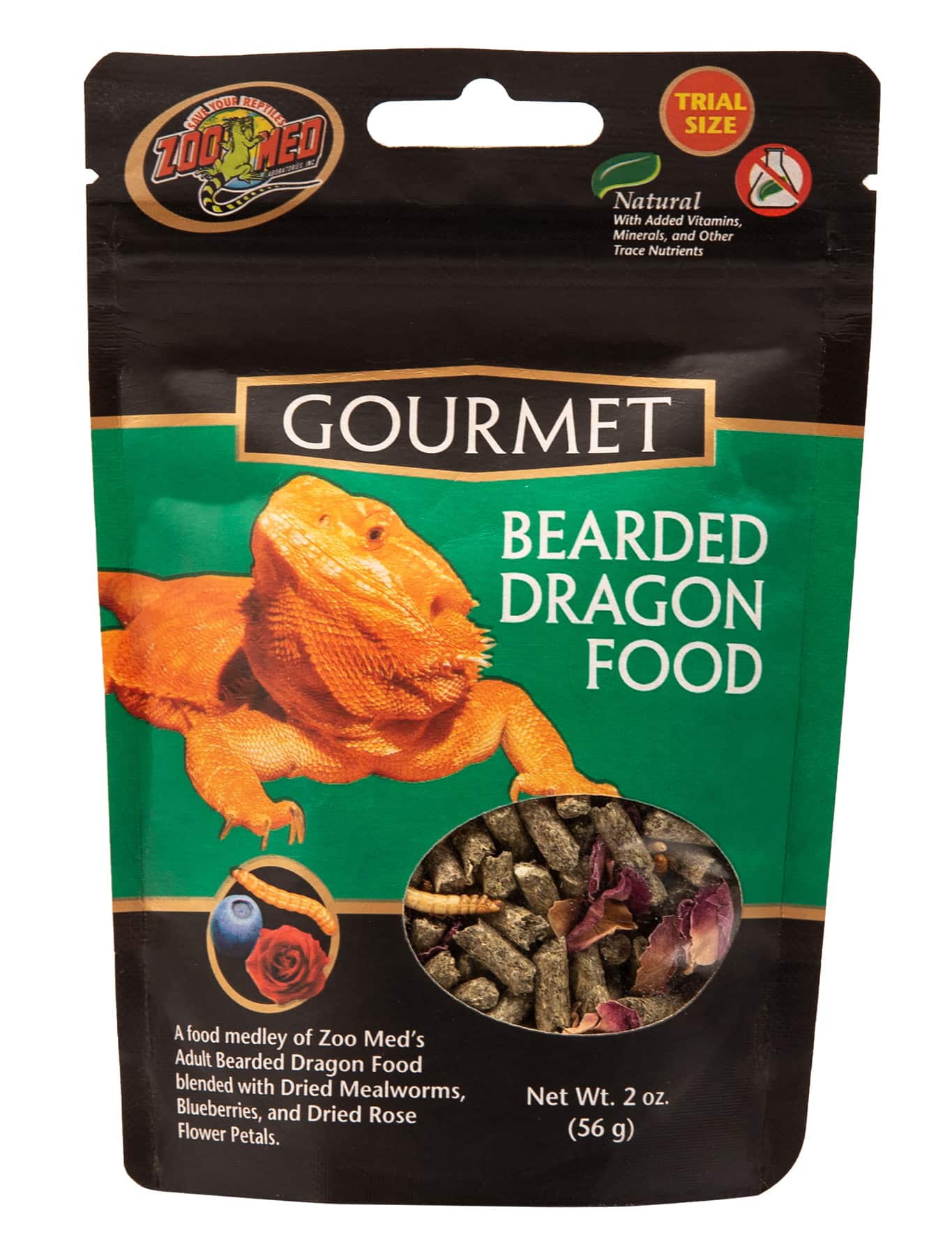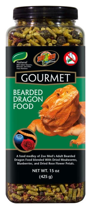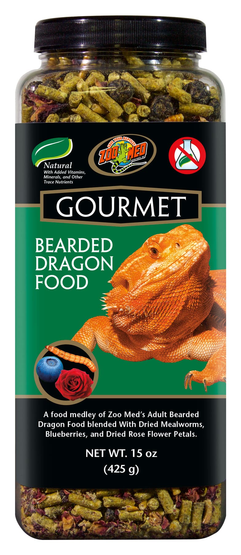 Zoo Medās Gourmet Bearded Dragon Food adds enrichment to your Dragonās diet with the addition of blueberries, mealworms, and dried rose flower petals. Zoo Med has over 40 years of experience researching the nutritional requirements of reptiles and developing food that meet their needs. This food is natural with added vitamins, minerals, and other trace nutrients. There are no artificial colors, flavors, or preservatives added!Ā