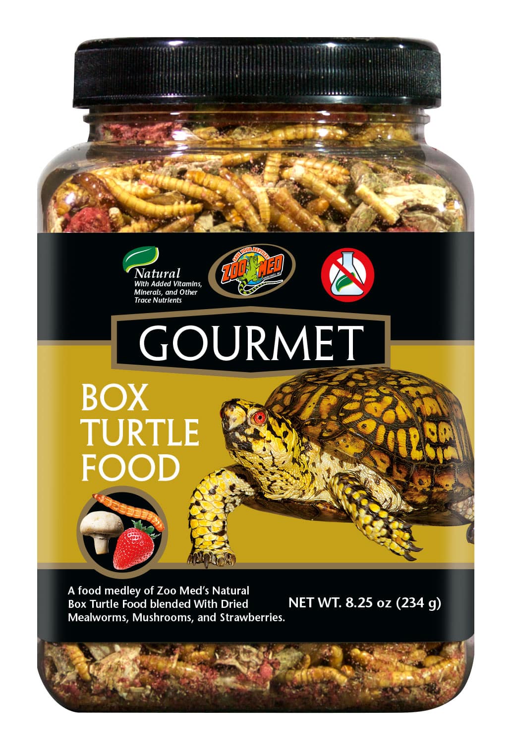Moisten food with water and allow it to sit for 3-5 minutes in order for strawberries and mushrooms to become saturated and create a flavorful mash that Box Turtles love. To help Box Turtles acclimate to new food, mix the moistened Gourmet Box Turtle Food with your Box Turtleās current diet and slowly reduce the amount of the current diet until the food is switched completely over. Offer food on a free choice basis and replace food daily. Natural Gourmet Box Turtle Food may be mixed with fresh greens, fruits, and vegetables for additional variety. Always provide clean drinking water treated with Zoo Medās ReptiSafe⢠water conditioner.