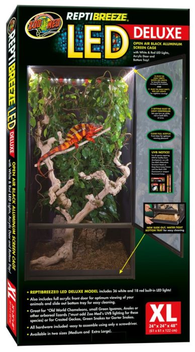 Zoo Med’s ReptiBreeze® LED Deluxe is an open air, screen enclosure that allows for ample air circulation, making it an ideal habitat for reptiles such as Chameleons, Crested Geckos, and More. Made with an aluminum frame and screen that resists rust and corrosion, this habitat has two doors on the front that provide for easy cleaning and terrarium access. This Deluxe version also features a clear acrylic door panel that allows for unobstructed terrarium viewing, an easy-to-clean, removable bottom tray that can be used to hold substrate and excess moisture, and also features built-in, touch-activated LED lights for illuminating your pet’s habitat with three different settings.