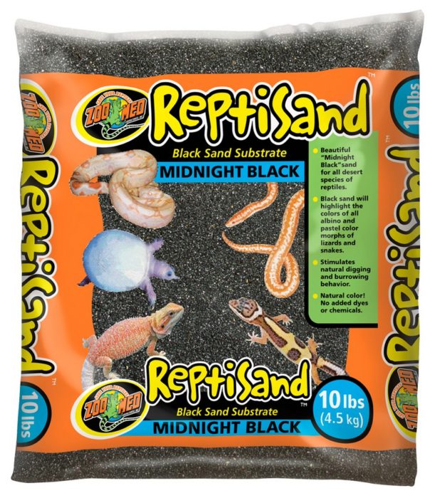 Beautiful “Midnight Black” sand for all species of desert reptiles. Black sand highlights the colors of all albino and pastel color morphs of lizards and snakes. Stimulates natural digging and burrowing behavior. Natural color! No added dyes or chemicals.