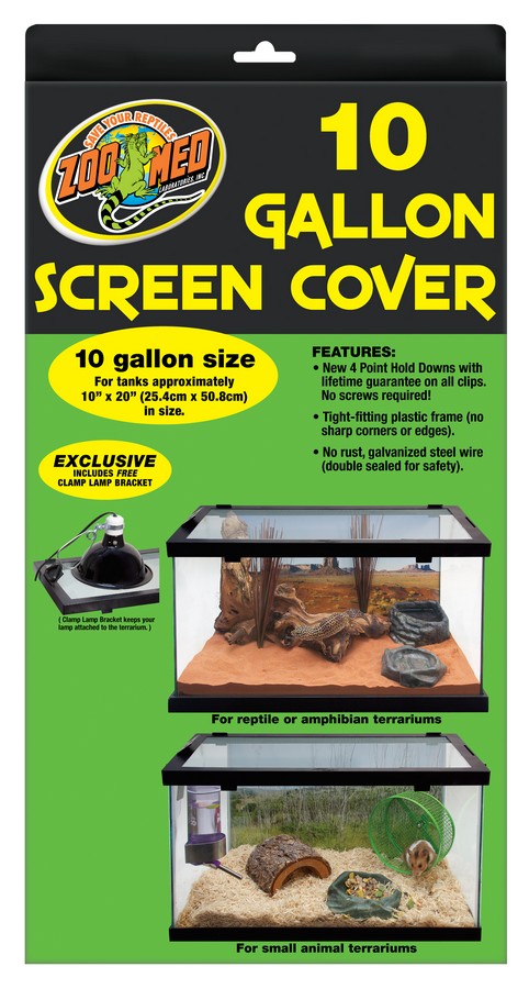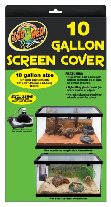 Zoo Med’s Screen Covers feature one piece plastic frame construction that clips on tight to prevent loss of valuable pets. Some models have access doors for easy routine maintenance (i.e. feeding crickets, etc.). No rust galvanized steel wire, double sealed for safety. Exclusive Clamp Lamp Bracket allows you to secure a clamp lamp to the top of your screen!