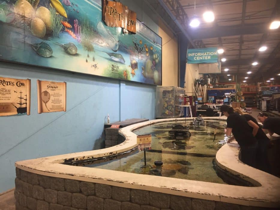 Right outside the fish room, you can find Pirate’s Cove! Pirate’s Cove is a 2,000-gallon, saltwater touch tank that gives customers a chance to touch real live stingrays. Come in on the weekend for their feeding shows and QA sessions.