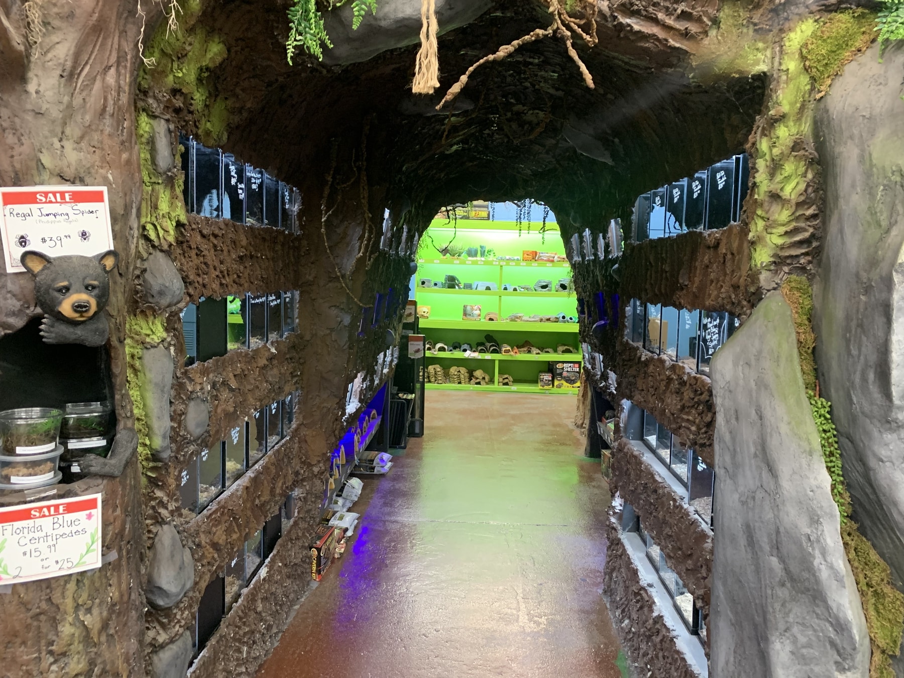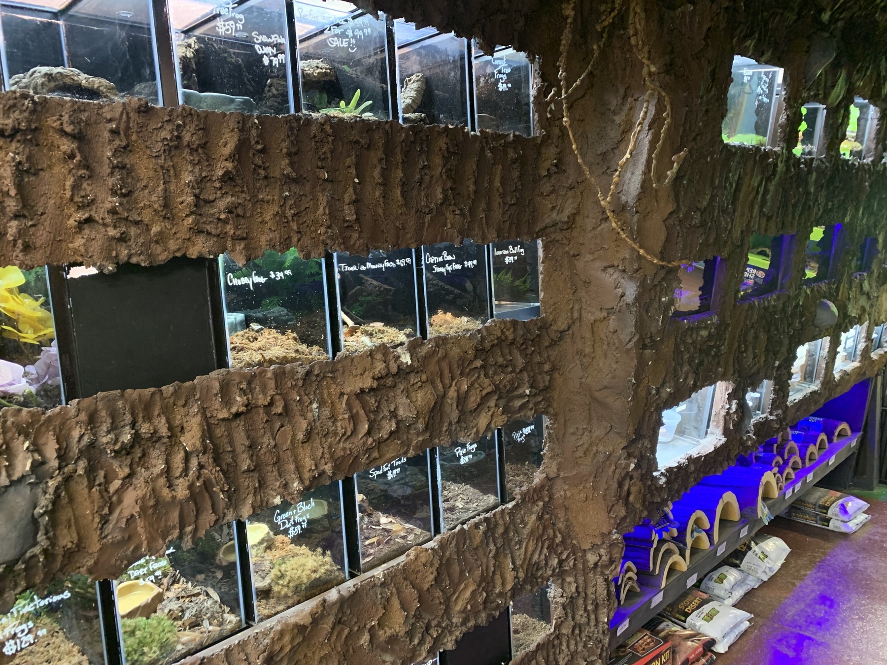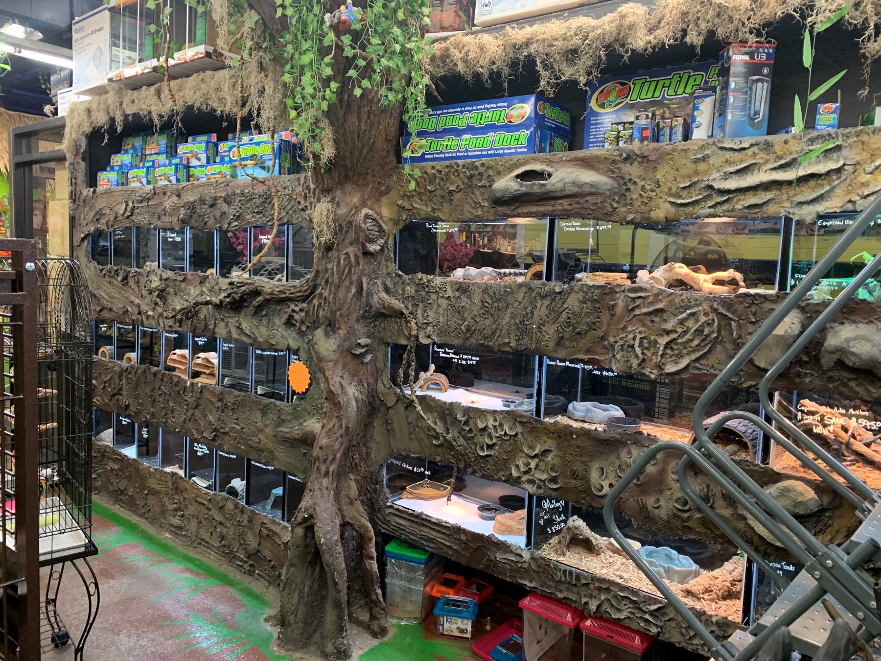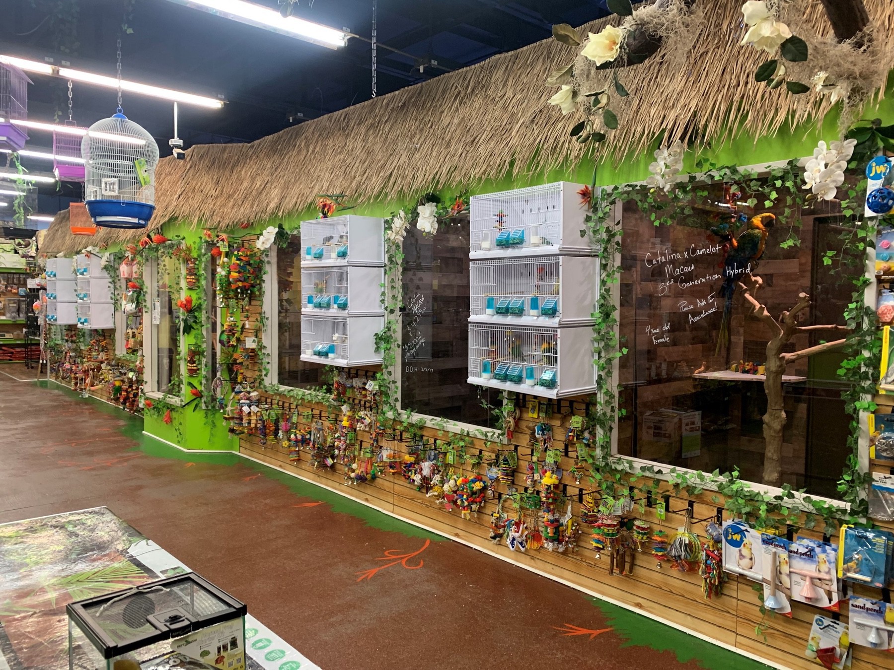 Walk through a cave of creepy-crawly pet displays, see a barnyard of potbelly pigs, skunks, and hedgehogs, or visit their aviary with toucans, macaws, and conures.  Store artwork and displays were custom-designed and created by one of the store’s employees. It’s easy to forget you walked in off the street and you’re not in the jungle or a country barnyard.