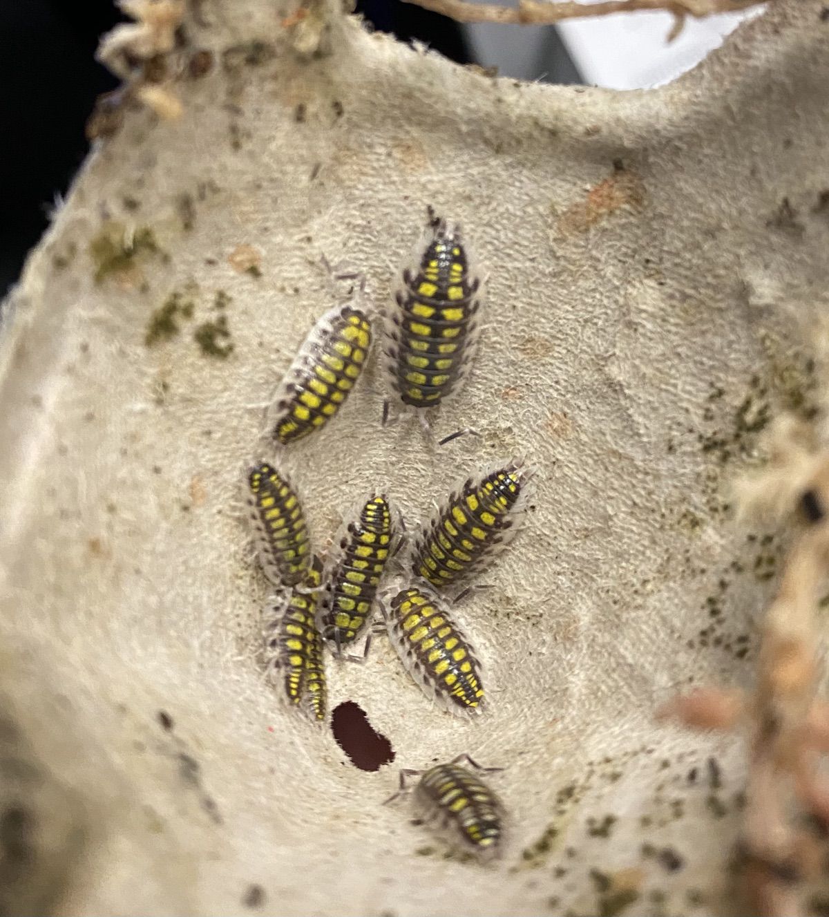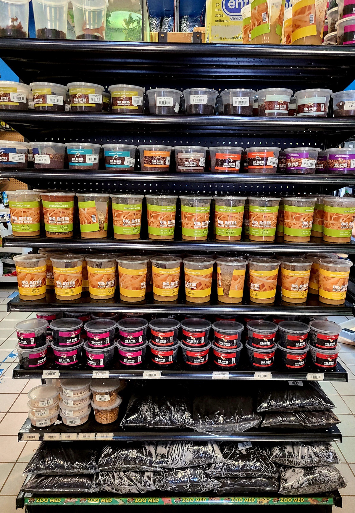 A huge variety of feeders are available: crickets are always available in multiple sizes, waxworms, mealworms, superworms, silkworms, hornworms, and black soldier fly larvae, frozen and live mice and rats, quail, chicks, and rabbits are sold to fulfill any pet reptile’s dietary requirements. Other unusual feeder items that are sold include Peanut beetles, Confused Flour beetles, and two varieties of fruit flies. Bioactive insects like 20+ different isopod species and three types of springtails, are always available for purchase as well.