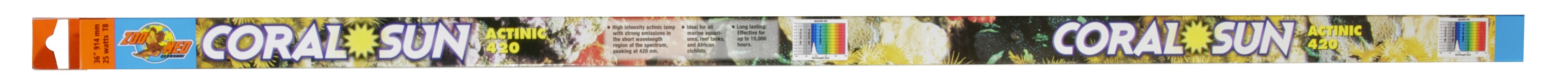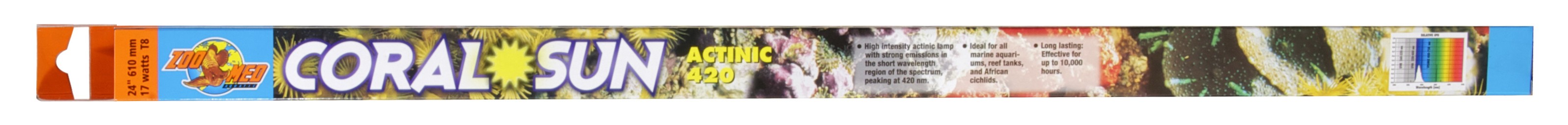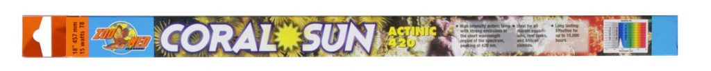 Coral Sun® is a high-intensity actinic lamp with strong emissions in the short wavelength region of the spectrum, peaking at 420nm. It promotes the growth of zooxanthellae algae, essential for the growth and well-being of all photosynthetic corals and invertebrates. This bulb simulates the short wavelength blue light which penetrates to reef depth in nature. Output closely matches the absorption peak of chlorophyll used in photosynthesis. Ideal for all marine aquariums or reef tanks. Zoo Med’s line of fluorescent aquarium lamps is made in Europe for ultra high quality, color, and longer burn life. Our energy saving T8 sizes can save you up to $30.00 per year in electricity over the thicker T12 size lamps! Effective up to 10,000 hours.