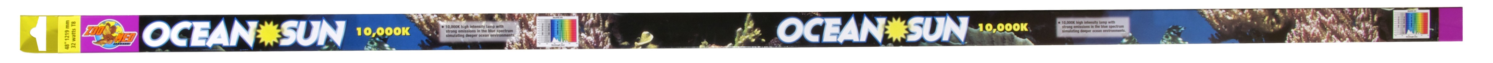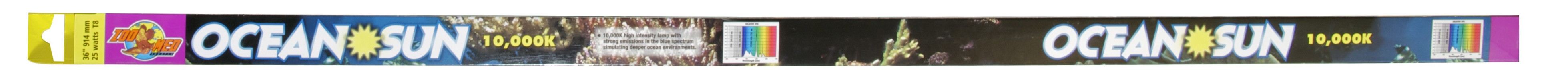 The Ocean Sun is a 10,000k high intensity lamp which creates a beautiful “deep ocean” effect in your marine or freshwater aquarium. This emission spectrum, strong in the blue regions, supports the photo biological processes of marine algae and freshwater plants. Ocean Sun promotes the growth of zooxanthellae algae, essential for the growth and well being of all photosynthetic corals and invertebrates. Ideal for all marine aquariums, and freshwater aquariums where a deep water effect is desired. Zoo Med’s line of fluorescent aquarium lamps are made in Europe for ultra high quality, color, and longer burn life. Our energy saving T8 sizes can save you up to $30.00 per year in electricity over the thicker T12 size lamps! Effective up to 10,000 hours.