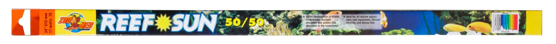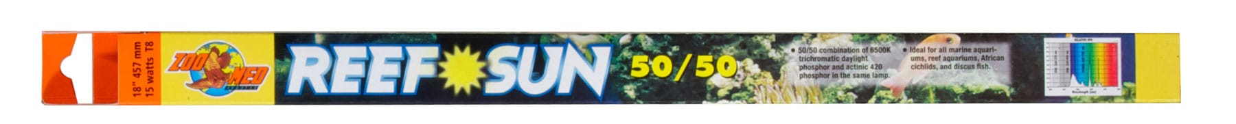 Our Reef Sun® bulb has a 50/50 combination of 6500K trichromatic daylight phosphor and actinic 420 phosphor in the same lamp. It provides high-intensity full spectrum illumination, strong in the short wavelength blue region essential for photosynthetic corals and invertebrates. Zoo Med’s Reef Sun bulb is balanced with 6500K daylight for natural color enhancement and viewing pleasure. Ideal for all marine aquariums, reef aquariums, African Cichlids, and discus fish. Zoo Med’s line of fluorescent aquarium lamps is made in Europe for ultra high quality, color, and longer burn life. Our energy saving T8 sizes can save you up to $30.00 per year in electricity over the thicker T12 size lamps!