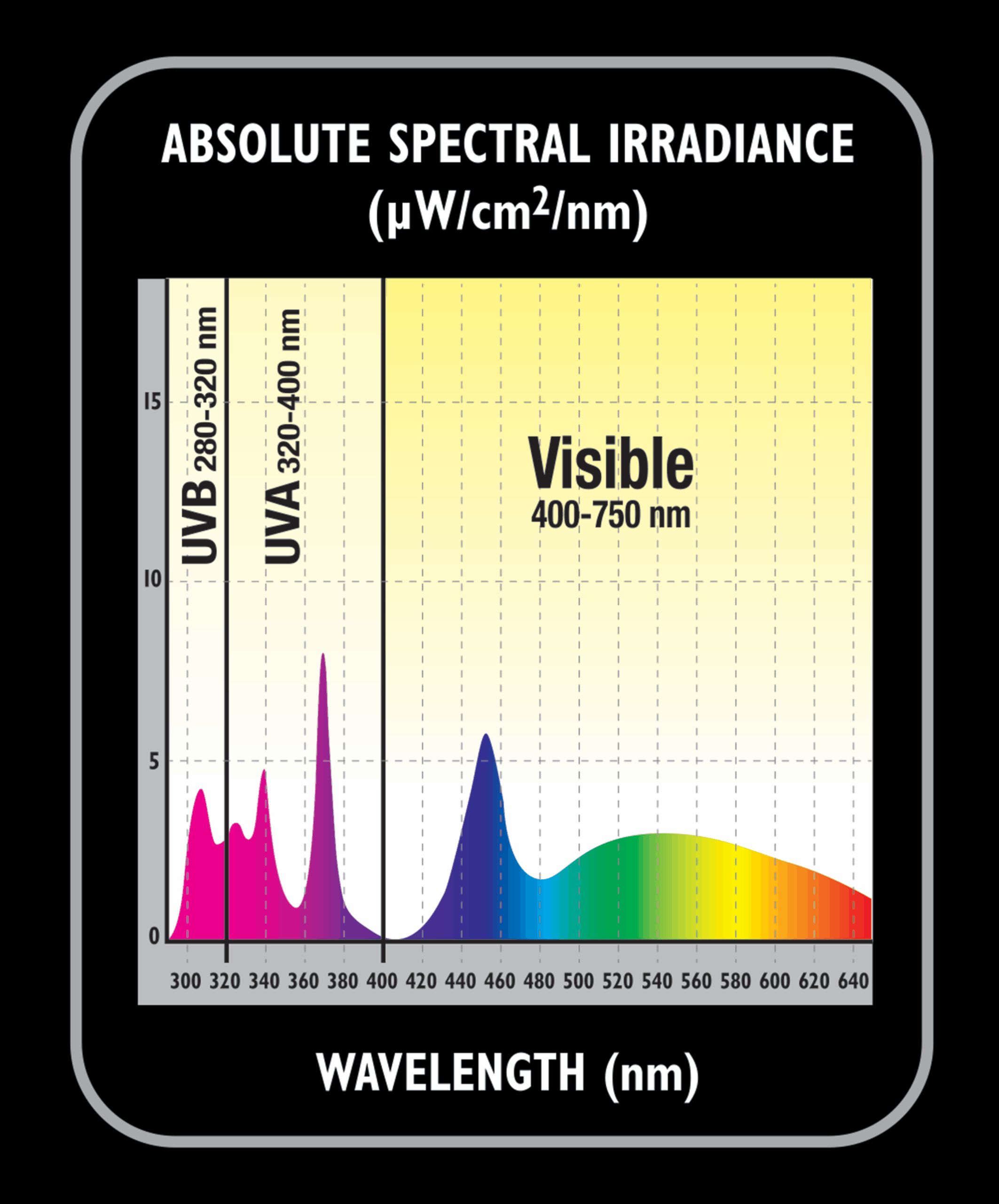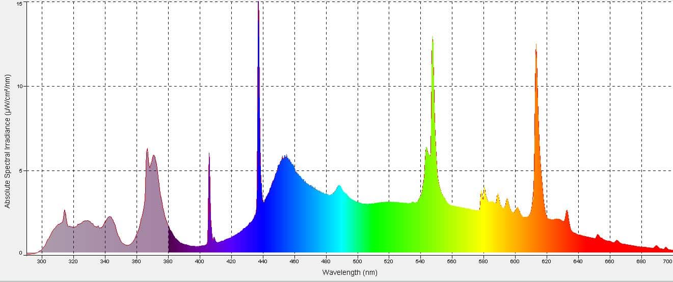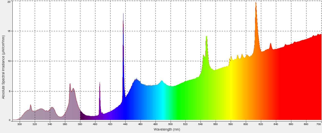 This lamp produces beneficial UVB, UVA, and visible light. (see figure B, close-up image of threshold wavelengths, in nanometers)